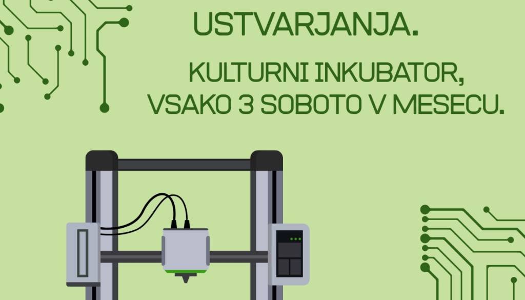 Kulturni inkubator, Koroška ulica 18, MariborVabljeni v Kulturni inkubator na mesečni 3D LAB — prostor, kjer se srečujejo ustvarjalnost, tehnologija in inovacije. Na delavnicah spoznaš osnove 3D tiska, pripravo modelov, prototipiranje in praktične primere uporabe. Primeren je za začetnike in izkušene ustvarjalce.