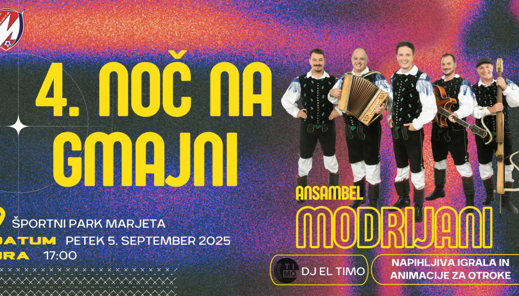 Športni park Marjeta na Dravskem poljuNa 4. Noči na gmajni vas čaka nepozabna zabava! Skupaj bomo peli in plesali ob glasbi Modrijanov, za prave ritme do jutranjih ur pa bo poskrbel DJ EL TIMO.
