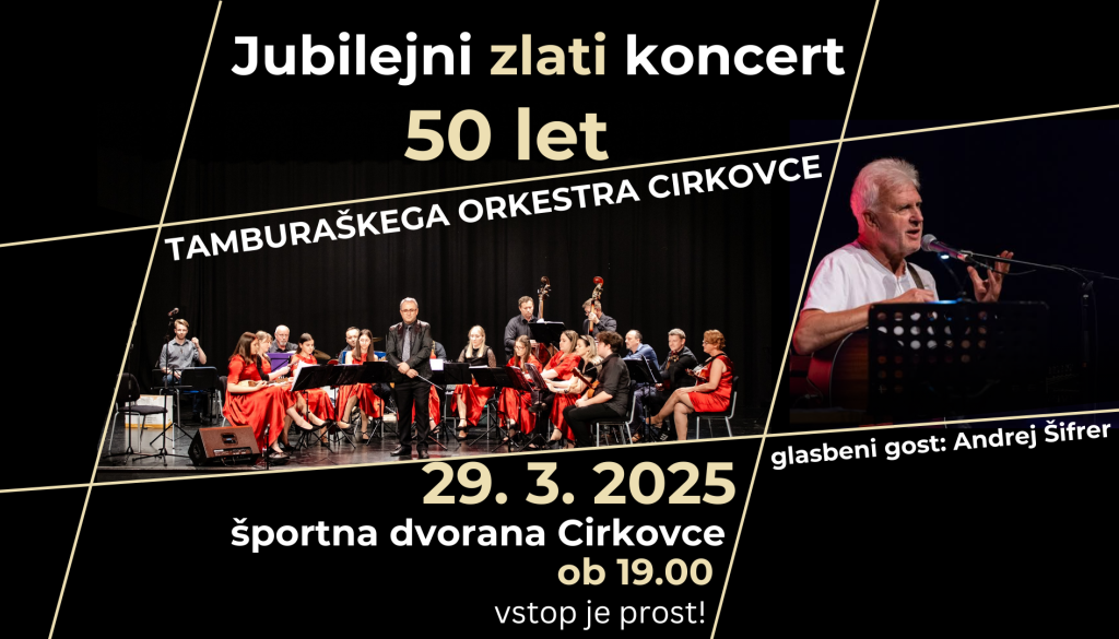 Športna dvorana CirkovceDne 29. 3. 2025 ob 19:00 praznujemo Cirkovški tamburaši 50. obletnico našega delovanja, dogodek pa bo potekal v Cirkovški večnamenski dvorani (Cirkovce 48, 2326 Cirkovce). Slavni gost bo Andrej Šifrer, vstop pa je prost.