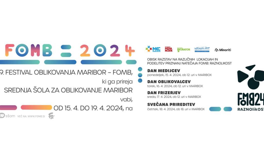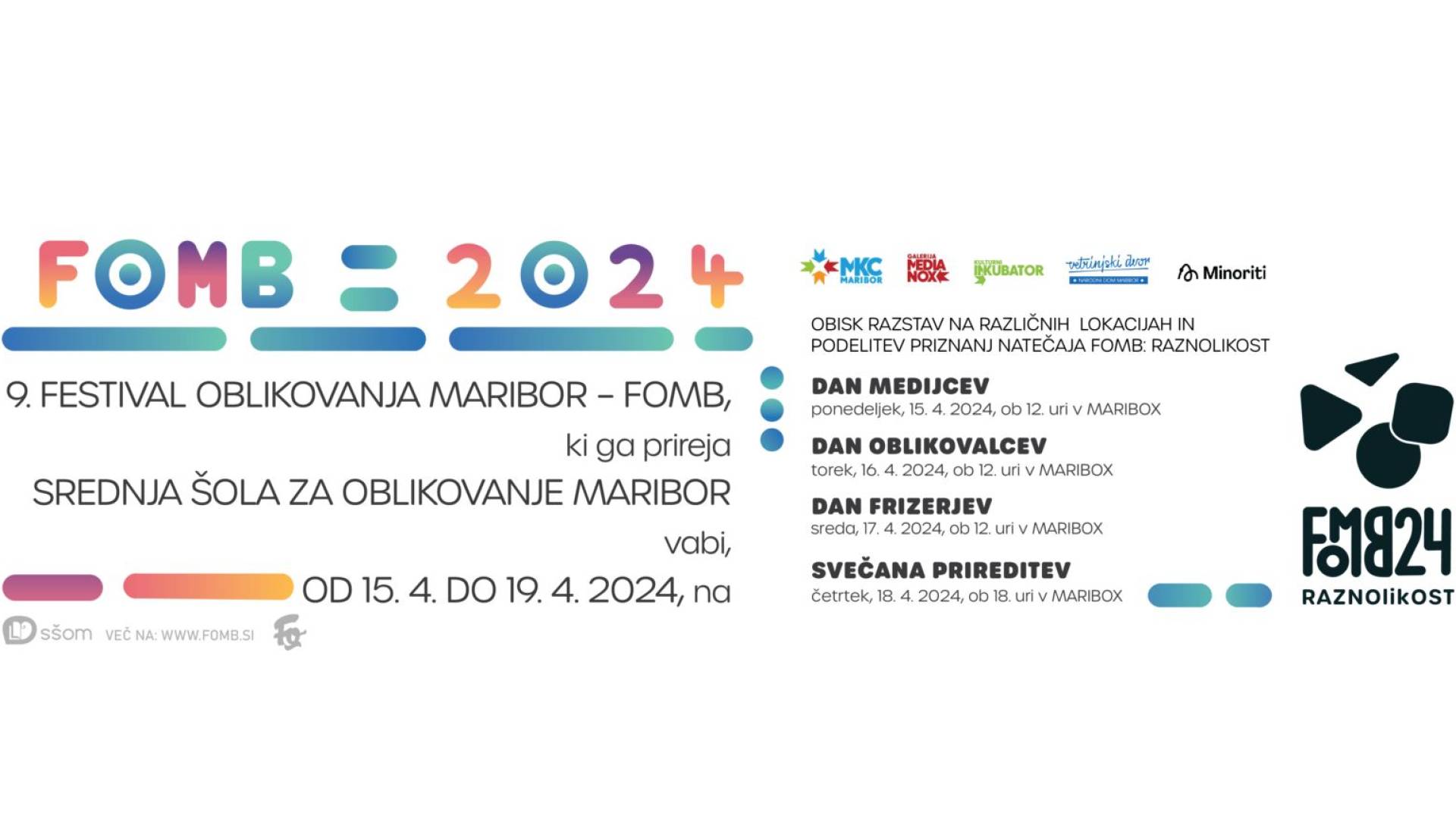 15. - 18. 4. 2024 - RAZSTAVIŠČNI PROSTORI (Sodni stolp, Media Nox, Vetrinjski dvor, Kulturni inkubator, SŠOM) – Del FOMB-a se dogaja tudi v razstaviščnih prostorih na različnih lokacijah v Mariboru, kjer so otvoritve razstav naših dijakov, udeležencev natečaja in učiteljev in seveda omogočeni ogledi le-teh.