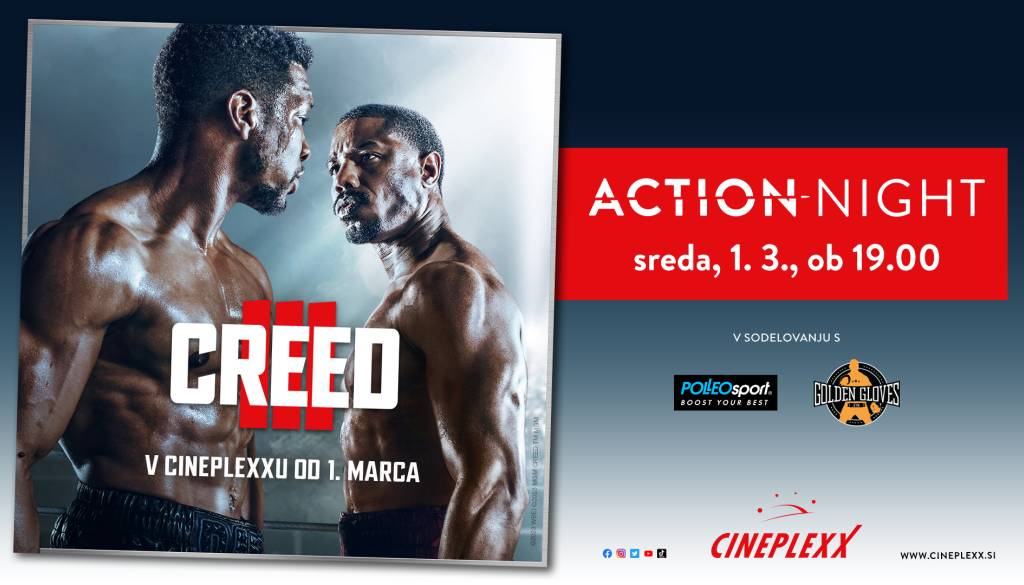 ACTION NIGHT CREED III Cineplexx Andreja Purger | 21. februar 2023 15:39 v Kino Termin Sreda, 1. marec 2023 19:00 - Sreda, 1. marec 2023 21:00 Lokacija Cineplexx Maribor ACTION NIGHT s filmom CREED III bo v sredo, 1. marca ob 19.00. V vseh kinih Cineplexx.