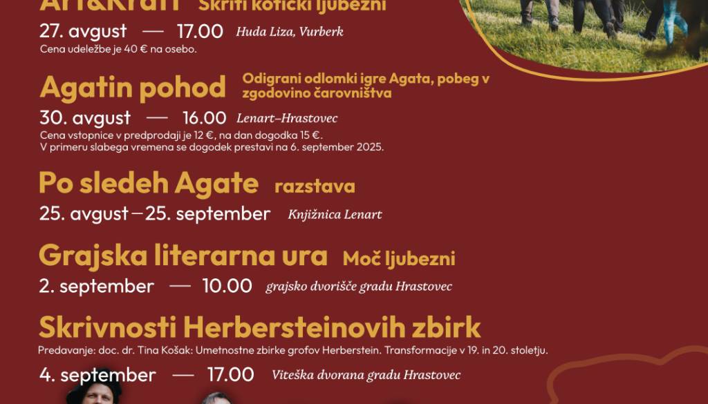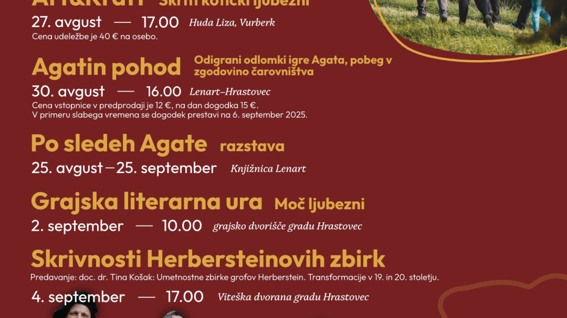 Na čarobnih prizoriščih Slovenskih goric se odvijajo dogodki, ki prepletajo pripovedi o Agati, domišljiji in zgodovini ter združujejo bogato lokalno dediščino z ustvarjalnostjo sodobnega časa.
