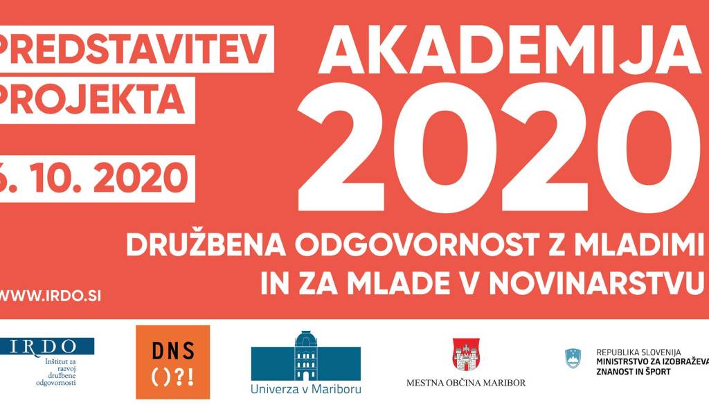 Univerza v Mariboru, Slomškov trg 15, MariborInštitut IRDO skupaj s partnerji, Društvom novinarjev Slovenije in Univerzo v Mariboru, v letu 2020 izvaja projekt Akademija 2020 – družbena odgovornost z mladimi in za mlade v novinarstvu.