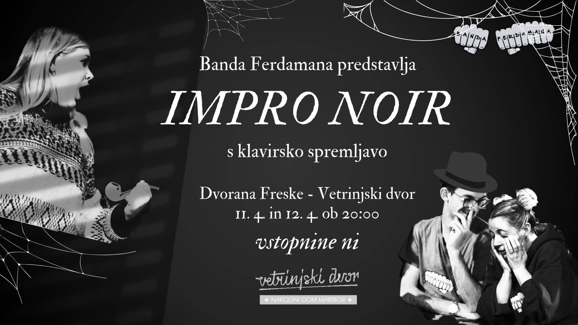 Ob 20.00 bodo v dvorani freske v Vetrinjskem dvoru na oder stopili improvizatorji KUD Banda Ferdamana, ki bodo za vas, po vaših predlogih in z vašim sodelovanjem uprizorili enkratno, nikoli ponovljivo predstavo. Vstop je PROST, zato le vabljeni vsi, ki ste vedno želeli biti del nečesa bolj temačnega. Da se boste lahko zares vživeli v predstavo, bo to spremljala klavirska spremljava v živo, dogajanje pa bo sočasno projecirano v črno-beli obliki na platnu.