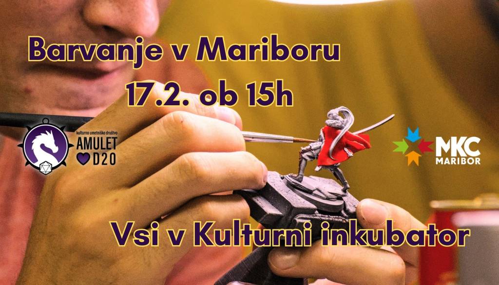 Kulturni inkubator, Koroška ulica 18, MariborDruštvo Amulet D20 vas v soboto, 17. 2. 2024, ob 15. uri vabi v Kulturni inkubator, Koroška cesta 18, Maribor na barvanje figuric. Vstop na dogodek je kakopak prost, vabljeni pa ste vsi navdušenci nad čopiči, barvami in figuricami, da se potopite se v svet barv, ne glede na to, ali ste izkušeni ali šele začenjate svojo pot v tem hobiju.