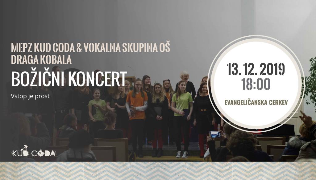 Evangeličanska cerkev MariborObračamo zadnji list na koledarju in čas je, da si vzamemo čas. Čas za druženje, čas za bližnje in čas za uživanje ob glasbi. All inclusive paket vam pod vodstvom Lee Gačnik ponuja MePZ KUD Coda na tradicionalnem božičnem koncertu, ki ga bodo tudi tokrat pospremile pevke Vokalne skupine OŠ Draga Kobala Maribor.