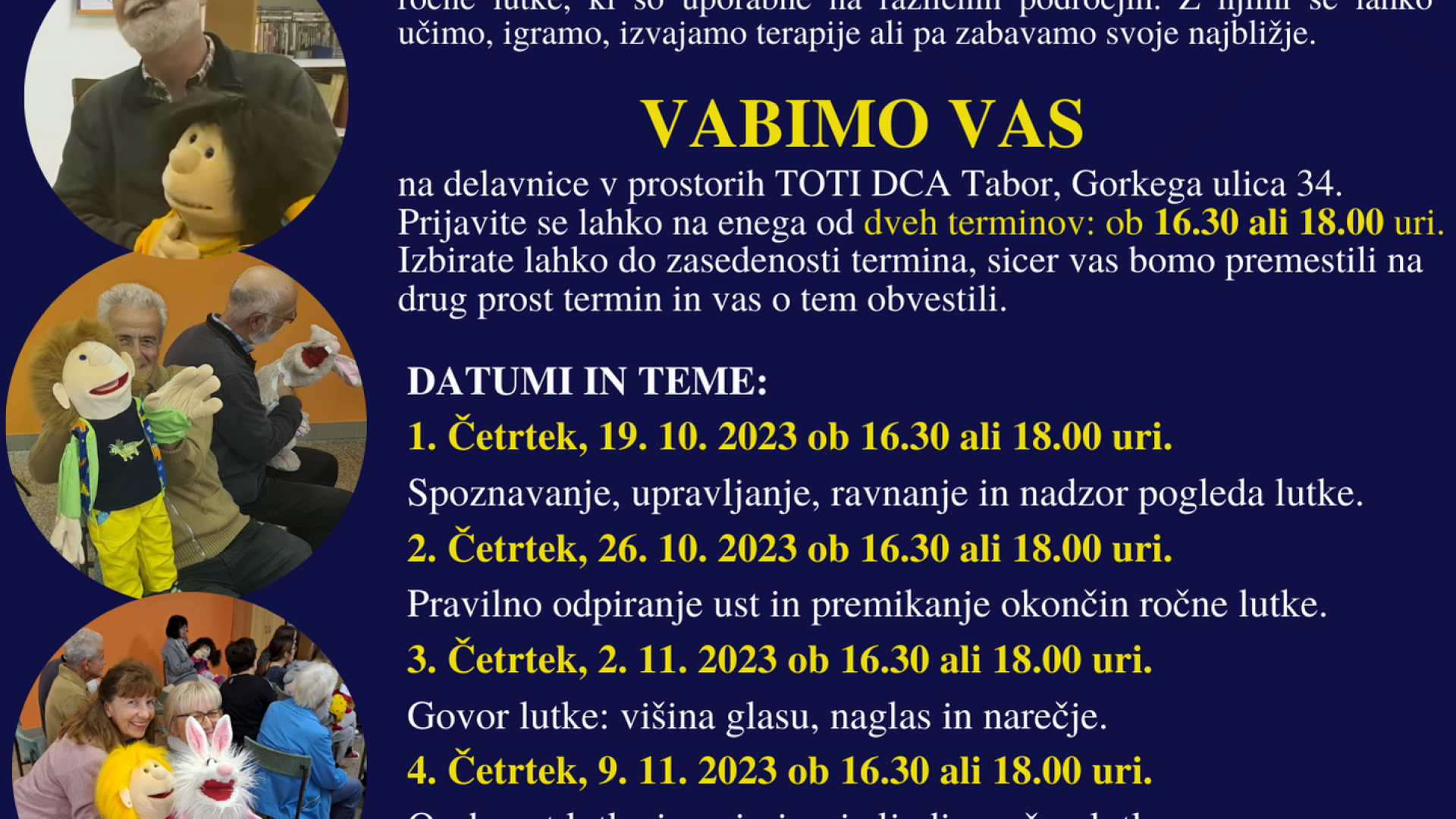 Brezplačne delavnice z ročnimi lutkami Jana Bohar | 18. oktober 2023 10:31 v Za otroke Termin Četrtek, 26. oktober 2023 18:00 Lokacija VGC Maribor, Gorkega ulica 34 Vabljeni!
