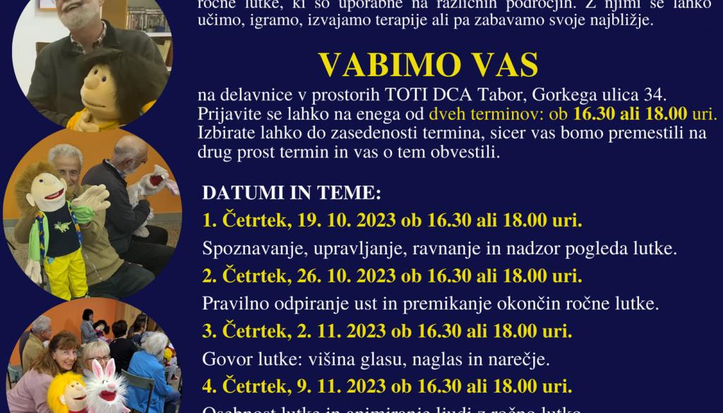 Brezplačne delavnice z ročnimi lutkami Jana Bohar | 18. oktober 2023 10:32 v Za otroke Termin Četrtek, 2. november 2023 18:00 Lokacija VGC Maribor, Gorkega ulica 34 Vabljeni!