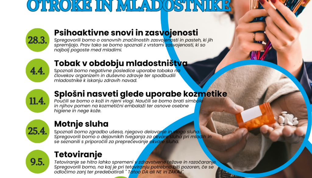 Kulturni inkubator, Koroška ulica 18, MariborV sodelovanju z Zdravstvenim domom Adolfa Drolca Maribor bomo v Kulturnem inkubatorju izvedli serijo brezplačnih predavanj o zdravstveni vzgoji za otroke in mladostnike. Kakšne so pasti tetoviranja, kako se ličiti in hkrati poskrbeti za kožo, kako se izogniti nezdravim navadam? To je le nekaj vprašanj, na katera bodo diplomirane medicinske sestre mladim podale odgovore. Serija delavnic bo med 28. marcem in 9. majem 2024, ob četrtkih ob 16. uri.