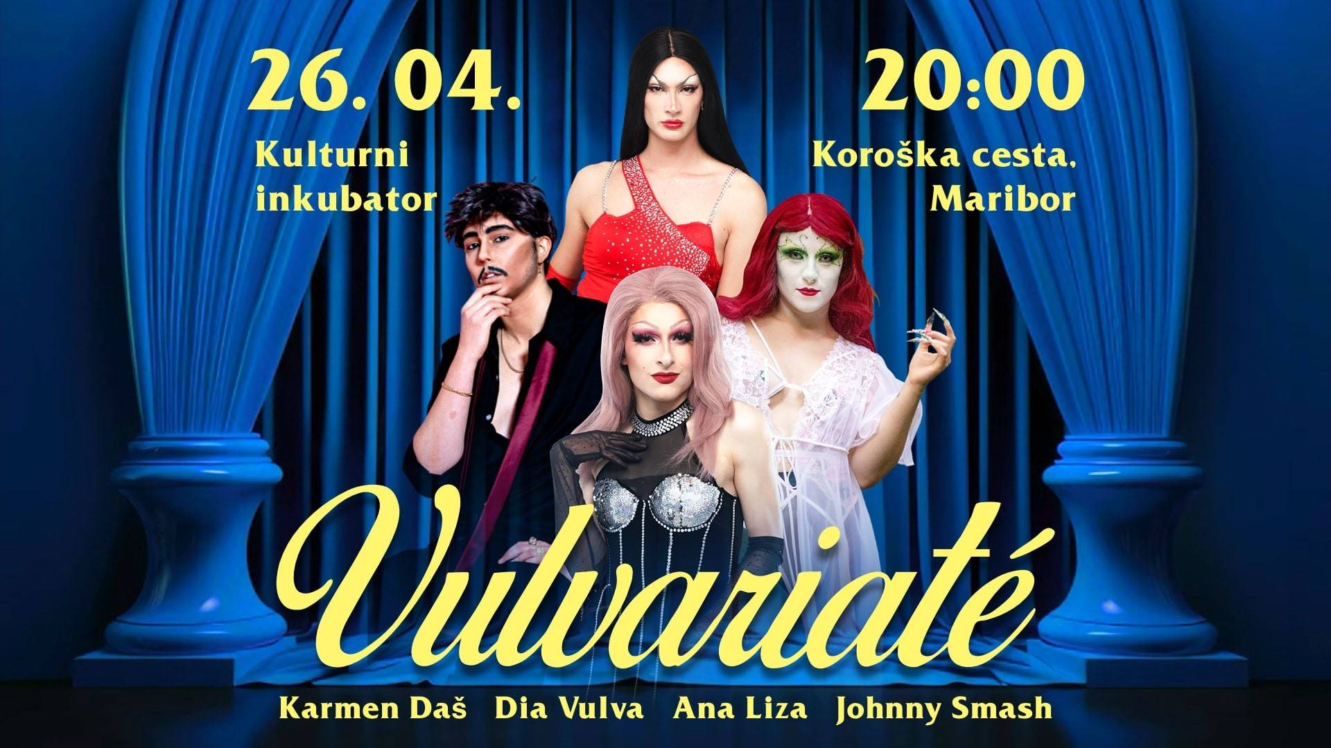 V soboto, 26. aprila 2025, se na oder Kulturnega inkubatorja vračajo kraljice preobleke iz mariborske zasedbe Haus of Vulva, tokrat tudi s kraljem preobleke.