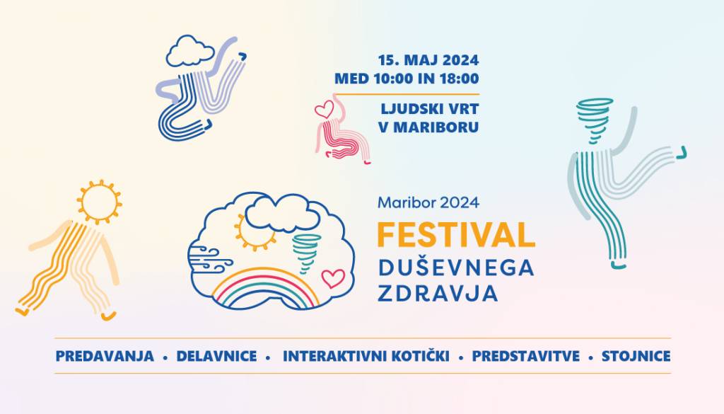 Ljudski vrt, MariborDa bi prebivalkam in prebivalcem Slovenije približali področje duševnega zdravja in dvignili ozaveščenost o pomembnosti duševnega zdravja, ki je mnogo več kot zgolj odsotnost bolezni, bo letos 15. maja 2024, od 10. do 18. ure, pred stadionom Ljudski vrt v Mariboru, potekal 2. Festival duševnega zdravja, ki je namenjen ljudem različnih starosti; mladostnikom, odraslim osebam (staršem, delovno aktivnemu prebivalstvu) in starejšim.