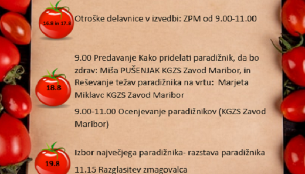 Festival paradižnika Jana Bohar | 9. avgust 2023 13:12 v Ostalo Termin Sreda, 9. avgust 2023 13:12 Lokacija Mariborska tržnica Vabljeni!