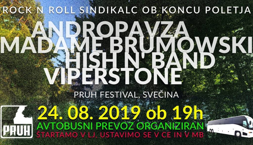 Pruh Svecina24. avgusta gremo v Svečino. Natančneje na Pruh, slikovit kamnolom sredi neokrnjene narave, kamor gremo z avtobusom trije bendi: Andropavza, Madame Brumowski, Hish N' Band in Viperstone! Pojdi z nami na rock n roll sindikalca tudi ti. Prostor na ? je še!