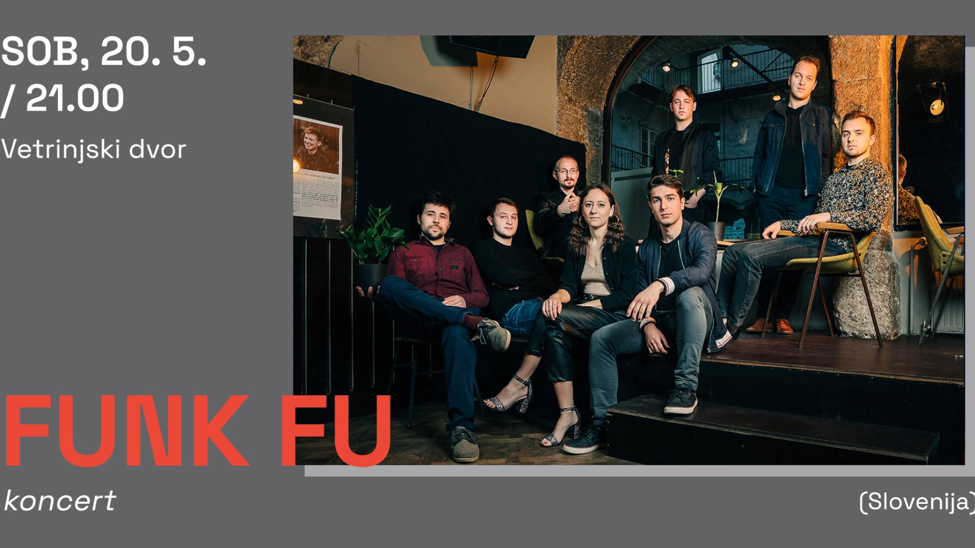 Funk Fu je slovenska glasbena skupina, ki jo na odru raznese kot glasbeno eksplozijo funka, popa in jazza. Osemčlanska zasedba že nekaj let skrbi za večerno sprostitev ob odlični glasbi. Skupina Funk Fu nas bo na koncertu premierno popeljala skozi pesmi prihajajočega albuma.