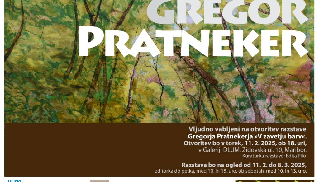 Galerija DLUMVljudno vabljeni na otvoritev razstave mag. Gregorja Pratnekerja »V zavetju barv«. Otvoritev bo v torek, 11. 2. 2025, ob 18. uri, v Galeriji DLUM, Židovska ul. 10, Maribor.