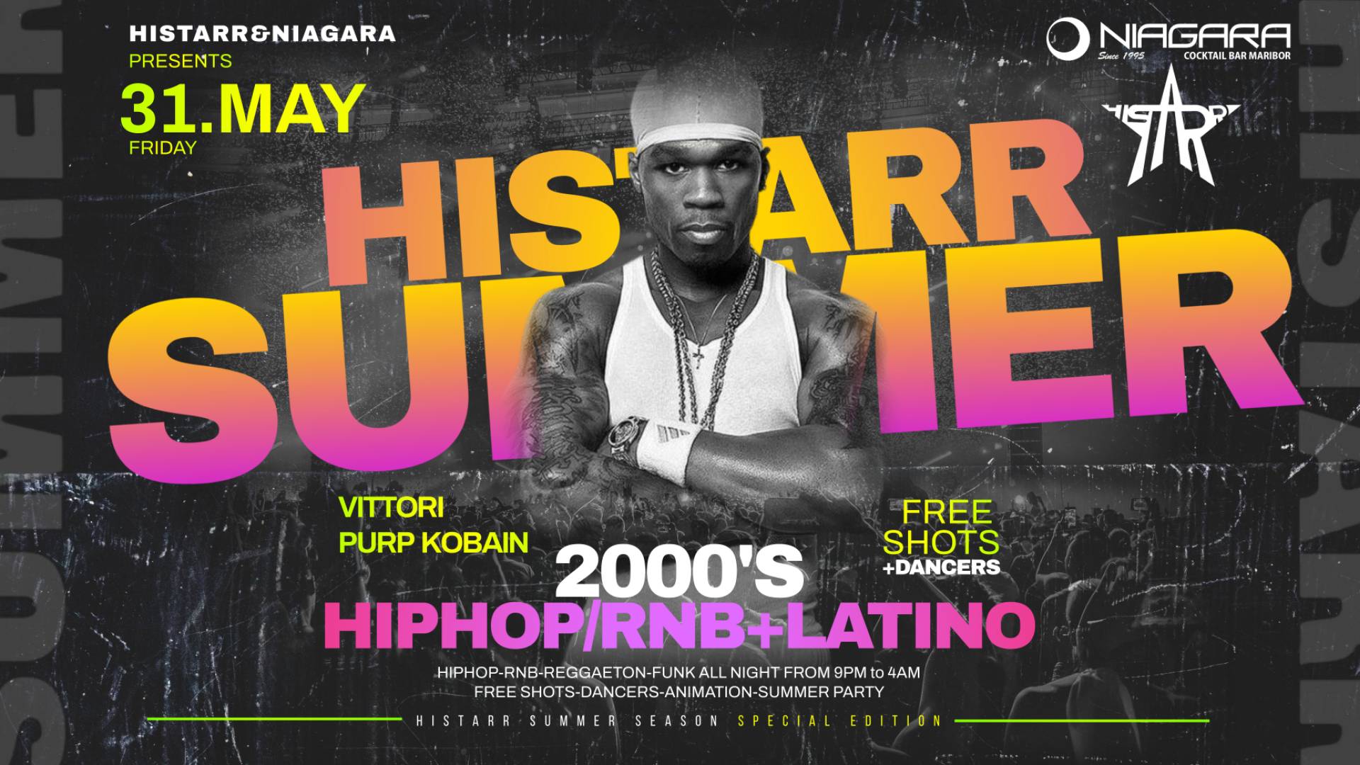 Pridružite se nam za noč, polno 2000's hip hop in R&B hitov ter latino ritmov (reggaeton), ki jih bosta vrtela DJ Vittori in Purp Kobain. Na odru se jima bodo pridružile plesalke, poleg tega pa vas čaka brezplačni shot na zunanjem šanku. 💃