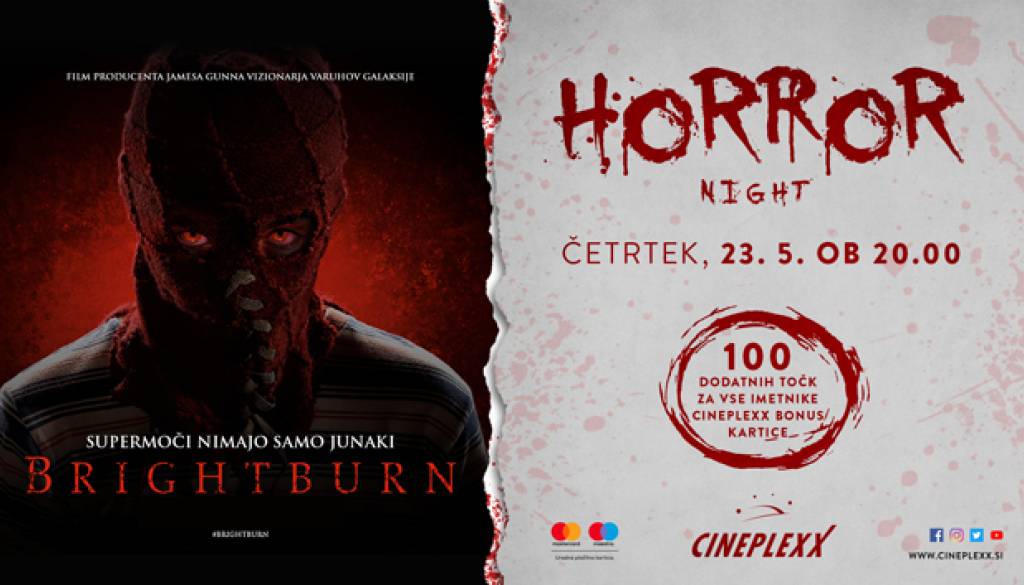 Cineplexx MariborLjubitelji grozljivk. V četrtek, 23. maja ob 20:00 si v Cineplexxu Maribor lahko ogledate grozljivko Brightburn na dogodku Horror night. Zveste člani - imenitniki Cineplexx bonus kartice prejmejo dodatnih 100 točk na kartico.