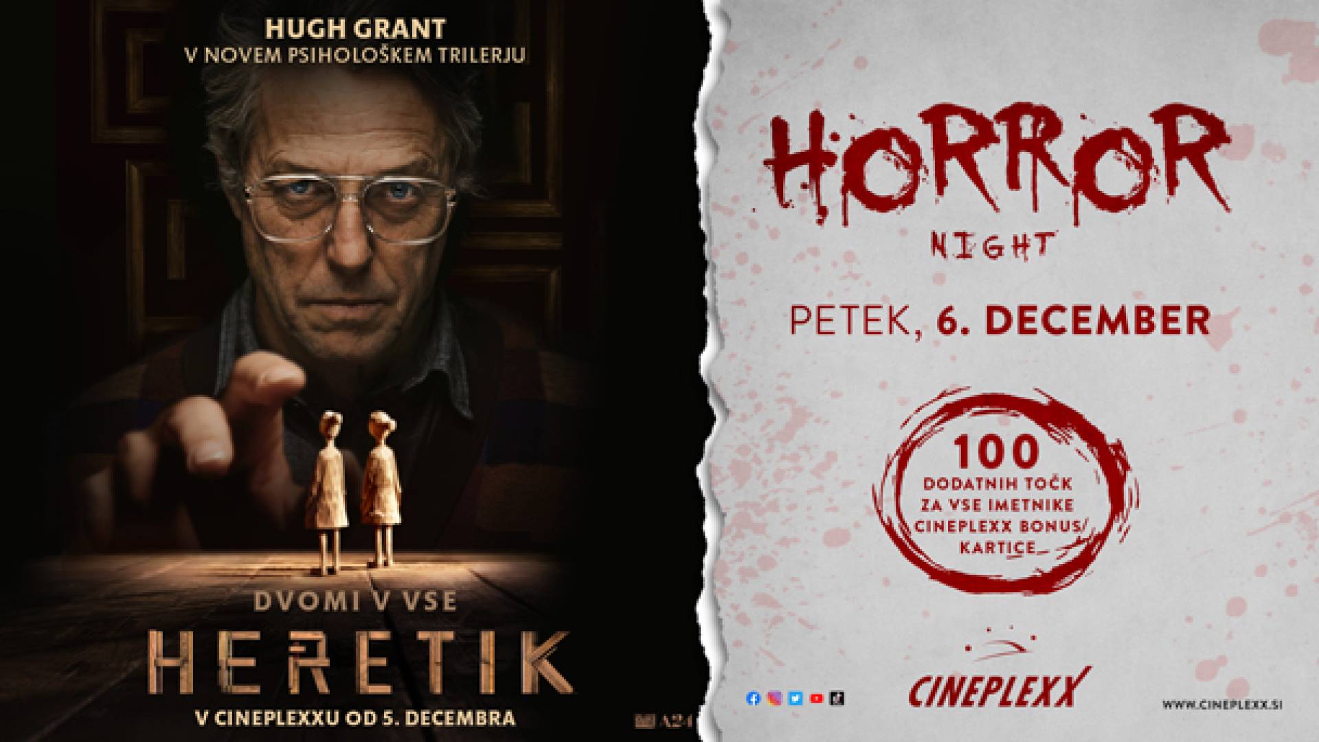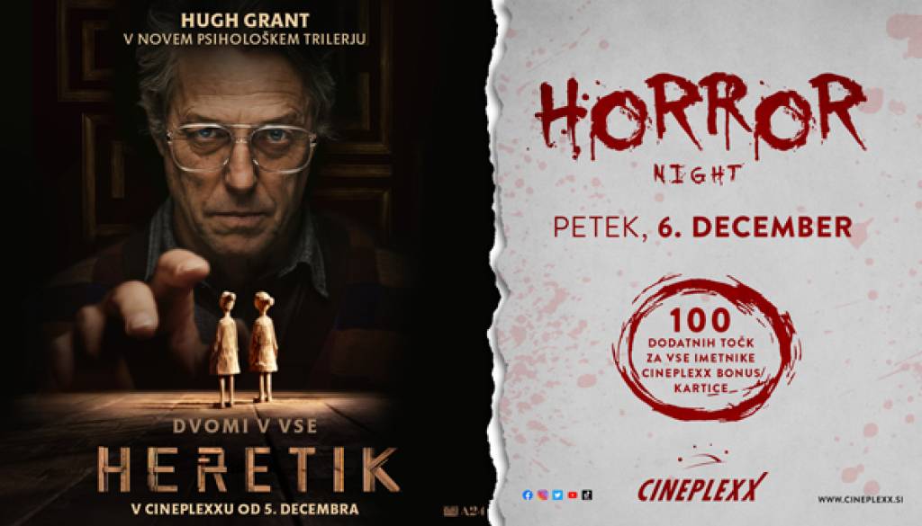 Cineplexx MariborPridruži se nam na Horror nightu s filmom HERETIK, ki bo v petek, 6. decembra 2024! Imetnike naše CBC kartice bomo nagradili s 100 dodatnimi točkami!