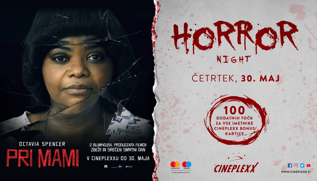 Cineplexx MariborLjubitelji grozljivk. V četrtek, 30. maja si v Cineplexxu Maribor lahko ogledate grozljivko Pri mami (Ma) na dogodku Horror night. Zveste člani - imenitniki Cineplexx bonus kartice prejmejo dodatnih 100 točk na kartico.