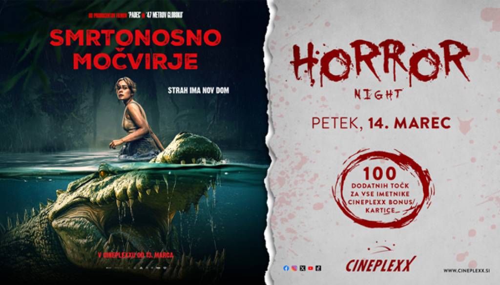 Cineplexx MariborPridruži se nam na Horror nightu s filmom SMRTONOSNO MOČVIRJE, ki bo v petek, 14. marca 2025! Imetnike naše CBC kartice bomo nagradili s 100 dodatnimi točkami!