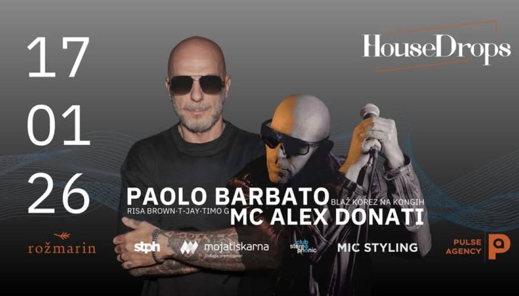 Rožmarin MariborTradicionalni januarski House Drops odpira leto 2026 z eno najbolj prepoznavnih house kombinacij v Sloveniji – Paolo Barbato & MC Alex Donati.