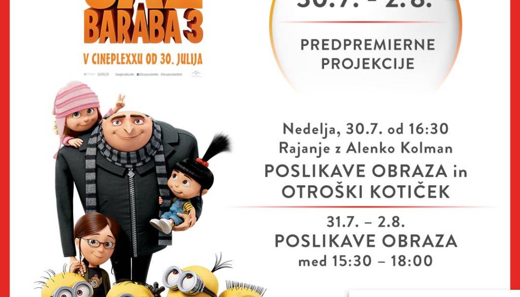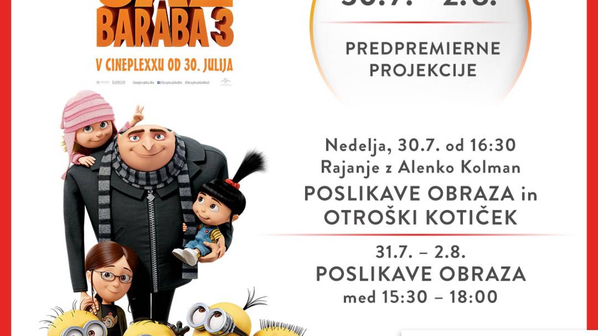 Cineplexx MariborV času predpremiernih projekcij animirane pustolovščine Jaz, baraba 3 med 30.7. in 2.8. v Cineplexxu Maribor čakajo otroke poslikave obraza z Minoni, pobarvanke in baloni v otroškem kotičku.