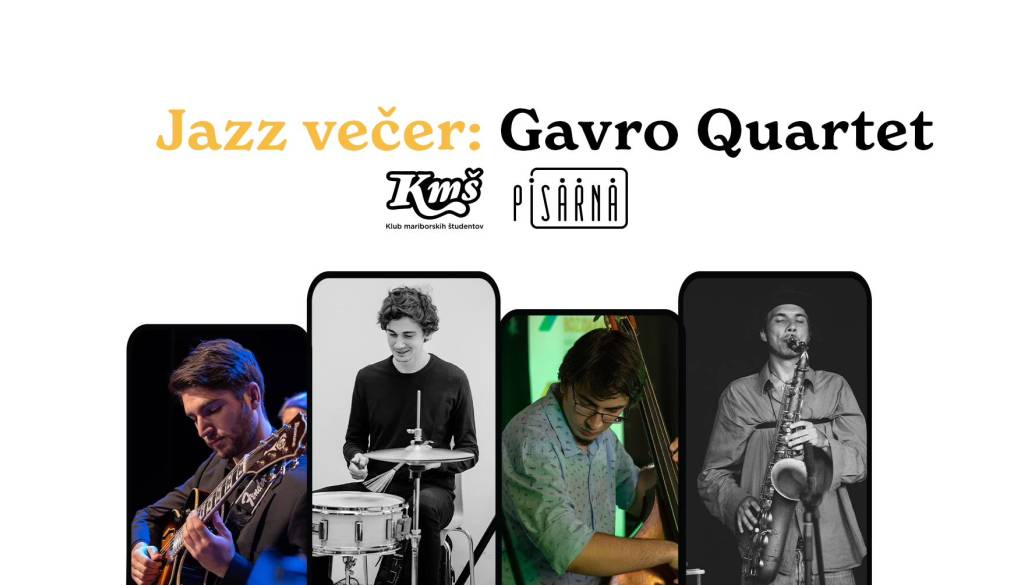Vabimo te na Jazz večer, ki bo v petek, 8. 12. 2023, v Pisarni. Začnemo ob 21.00. Z nami bo dinamični ansambel, Gavro Quartet!