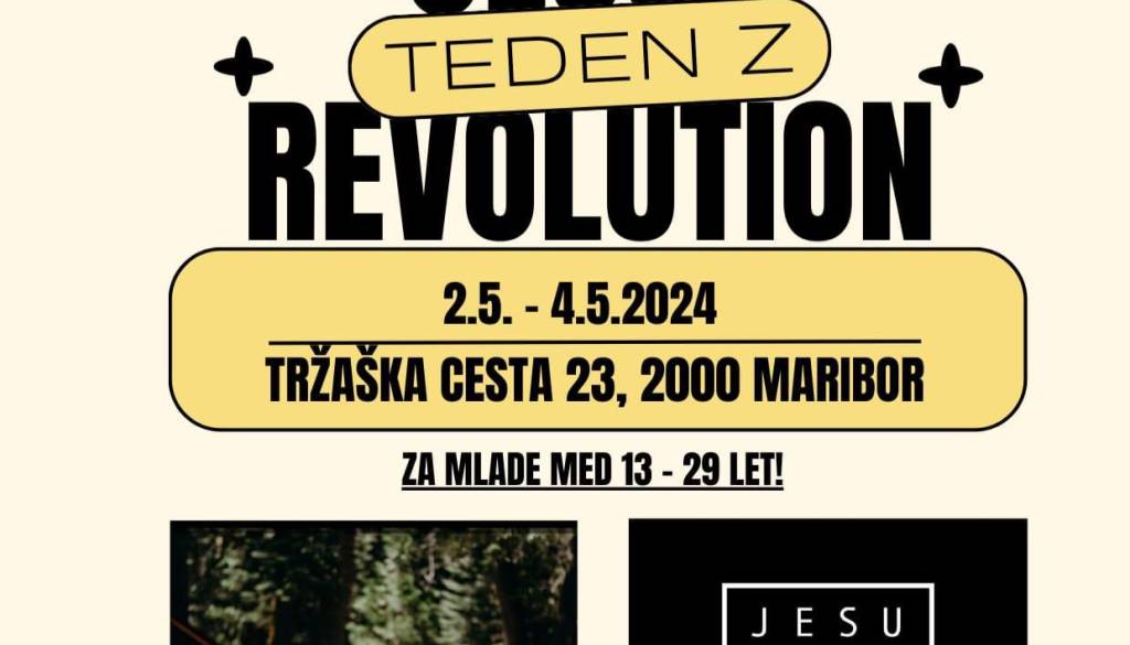 Jezus je pot v sodelovanju z Jesus Revolution pripravlja izjemen dogodek, ki bo potekal 2.5.- 4.5., na Tržaški cesti 23, 2000 Maribor in je namenjen vsem mladim v starosti med 13 - 29 let, ki hrepenijo po Božji ljubezni in dotiku.