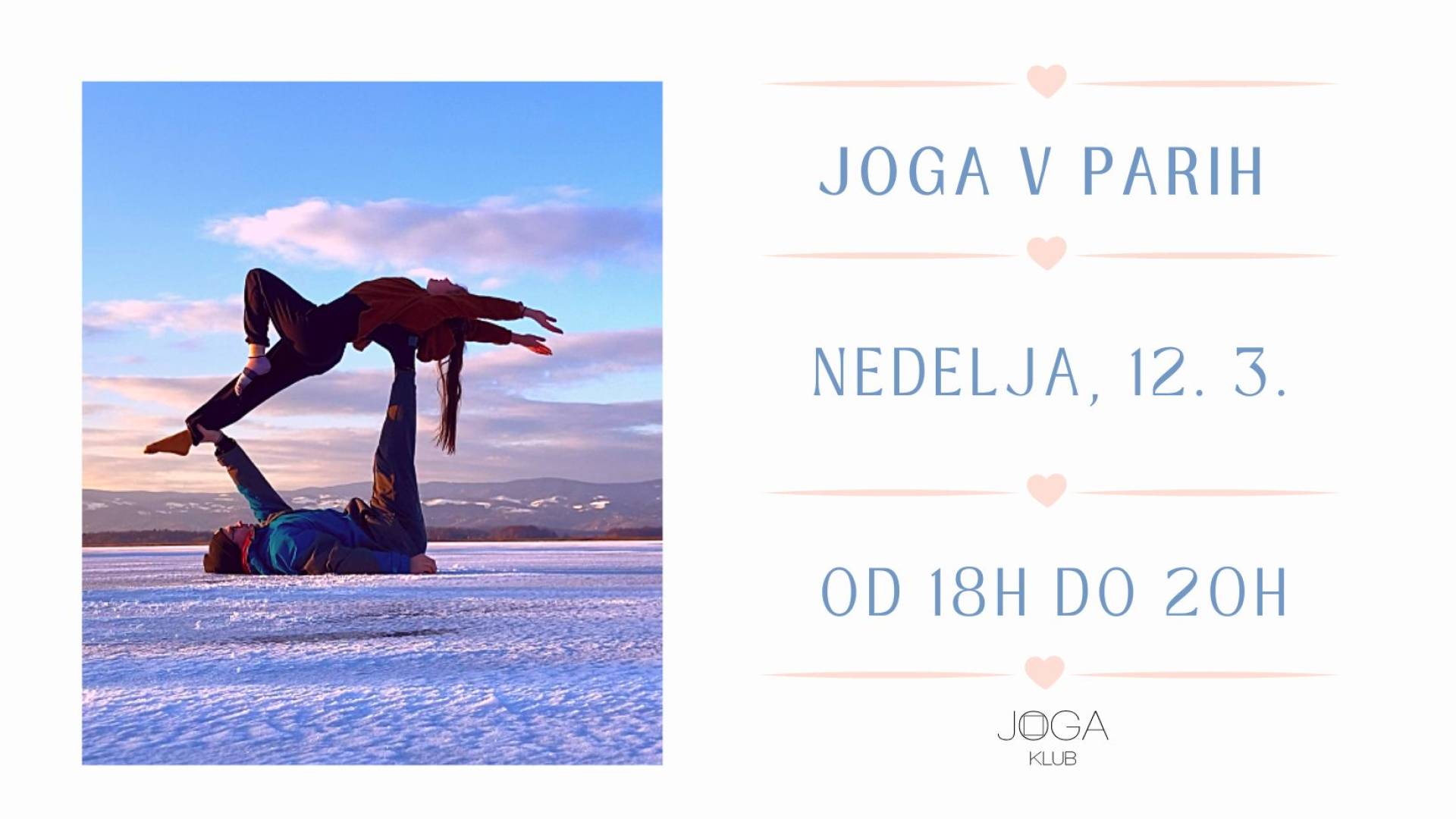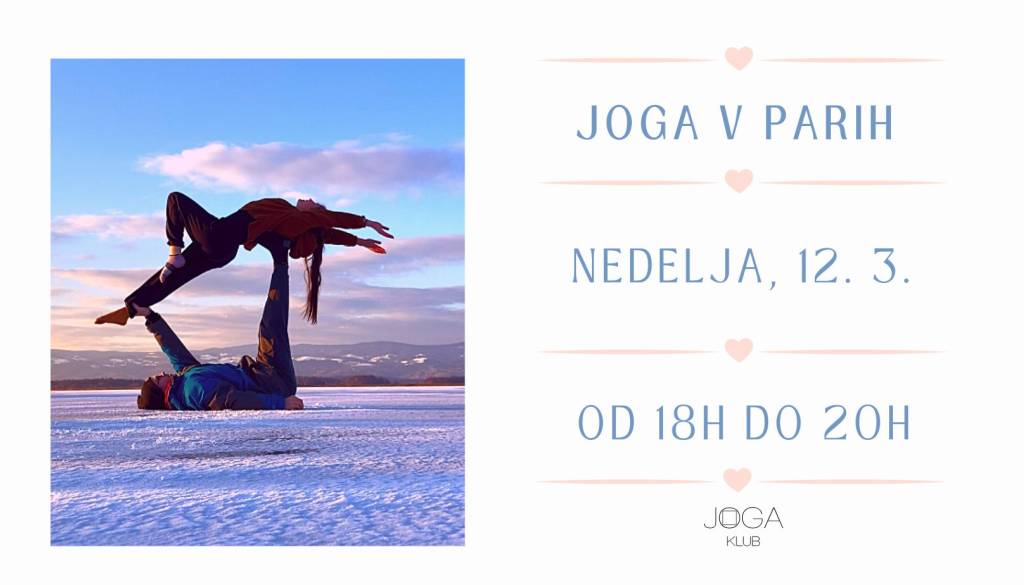 Joga v parih je vadba, kjer jogijske položaje izvajata dve osebi, ki si pomagata in vodita v položaj z dotikom. Pri tem je ključnega pomena jasna komunikacija in osredotočenost na partnerja, hkrati pa ohranjanje pozornosti na lastnem telesu, dihanju in čutenju. Položaji se gibljejo od partnerskih jogijskih položajev za začetnike do bolj akrobatskih položajev – akrojoge. Na začetku vedno delamo v skupinah, kjer je najmanj en varovalec. Baza je tista, ki je stabilna in umirjena na tleh ter vodi letalca, ki je čvrst, se zaveda svojega telesa in zaupa. Najprej naredimo nekaj gibalnih vaj sami, da uskladimo svoje dihanje z gibanjem, potem se uskladimo in poletimo s partnerjem, na koncu pa sledi sprostitev, masaža. Skozi igro in zabavo razvijamo mišice, raztegljivost in ravnotežje. Vadimo pa tudi zbranost, vztrajnost, komunikacijo in sodelovanje. Vadba je primerna za vse starostne skupine in je odličen način za krepitev odnosa tudi izven dvorane, saj se poveča občutek medsebojne povezanosti in zaupanja. Vse vaje in spoznanja so uporabni za naše vsakdanje življenje in nam pomagajo pri osebnostni rasti ter odnosih. Naše gibanje nam pokaže kdo smo. Naučili se bomo nekaj enostavnih, statičnih položajev, ki jih bomo kasneje povezali v tok, gibanje po zraku.