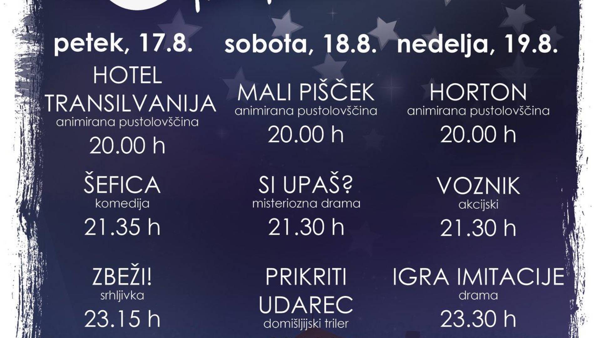 KINO POD ZVEZDAMI 2018 Sosednji prijatelji Kidričevo | 17. avgust 2018 11:01 v Termin Petek, 17. avgust 2018 20:00 - Nedelja, 19. avgust 2018 0:00 Lokacija Prizorišče pred Športno dvorano Kidričevo Vabljeni na Kino pod zvezdami v Kidričevo!
