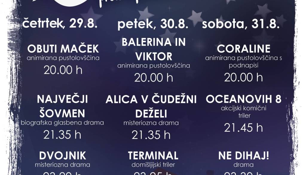 KINO POD ZVEZDAMI 2019 KIDRIČEVO Sosednji prijatelji Kidričevo | 30. avgust 2019 11:46 v Termin Petek, 30. avgust 2019 20:00 - Sobota, 31. avgust 2019 1:30 Lokacija Prizorišče pred Športno dvorano Kidričevo Lepo vabljeni na Kino pod zvezdami 2019. Vstopnine ni! :)