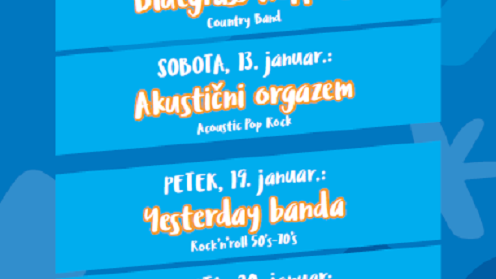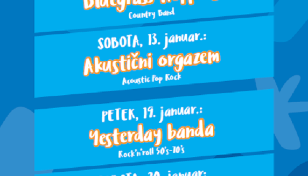 Ploščad pred spodnjo postajo gondoleV soboto 20. januarja ob 19. uri bo na ploščadi pred spodnjo postajo gondole koncert skupine L. A. Band.