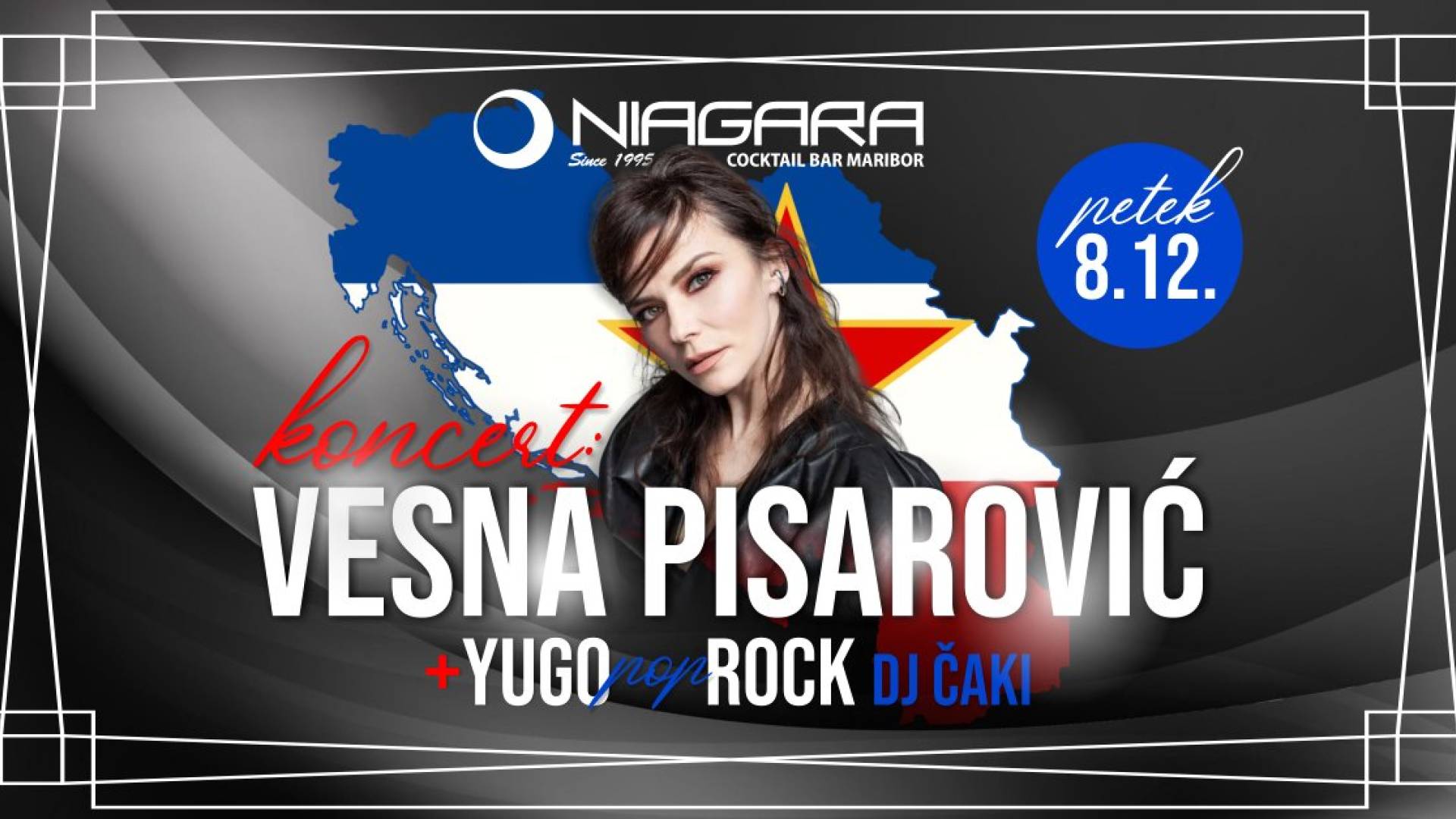 NIAGARA Lounge BarVesna Pisarović se vrača v Niagara cocktail bar! 8. 12. 2023 bomo peli in plesali na njene največje hite na Yugo pop rock noč. Vesna se uveljavlja kot pop pevka na domačem Hrvaškem, pa tudi v drugih državah nekdanje Jugoslavije. Njeni hiti so: Da znaš, Dolje na koljena, Jutro donosi kraj, Da sutra umrem, Neka ljudi govore, Da je meni in mnogi drugi. Vabljeni, da se naužijete njenega izjemnega vokala.