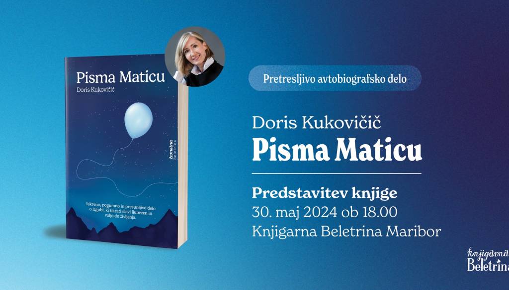 Grajski trg, MariborMajske literarne popoldneve v Knjigarni Beletrina Maribor zaključujemo s sveže izdanim avtobiografskim prvencem Doris Kukovičič, ki vas bo ganilo do solz. O delu Pisma Maticu se bo v četrtek, 30. maja 2024, ob 18. uri z avtorico pogovarjala Tjaša Lešnik. Vabljeni!