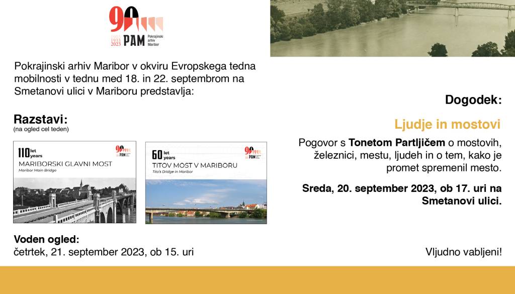 Fakulteta za gradbeništvo, prometno inženirstvo in arhitekturoPokrajinski arhiv Maribor v sodelovanju s Fakulteto za gradbeništvo, prometno inženirstvo in arhitekturo Univerze v Mariboru organizira dogodek: "Ljudje in mostovi", pogovor s Tonetom Partljičem o mostovih, železnici, mestu, ljudeh in o tem, kako je promet spremenil mesto. Vljudno vabljeni!
