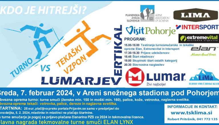 V organizirani skupini bomo vsako sredo skupaj nabirali izkušnje, znanje in kondicijo. Predvsem pa se bomo družili. Vzpenjali se bomo za označevalnimi količki ob desnem robu prog do Bellevuja. Naša skupna sredina druženja bomo zaključili 𝟕. 𝐟𝐞𝐛𝐫𝐮𝐚𝐫𝐣𝐚 𝟐𝟎𝟐𝟒, ko bo potekal sedaj že tradicionalen 𝐋𝐔𝐌𝐀𝐑𝐉𝐄𝐕 𝐕𝐄𝐑𝐓𝐈𝐊𝐀𝐋. Na njem se v vzponu na Pohorje za res in za zabavo, pomerijo turni smučarji in gorski tekači.