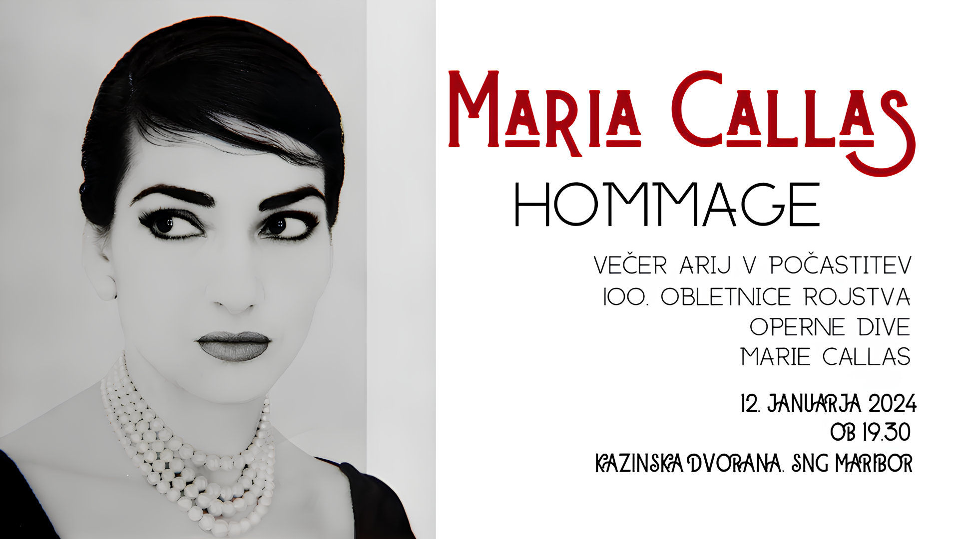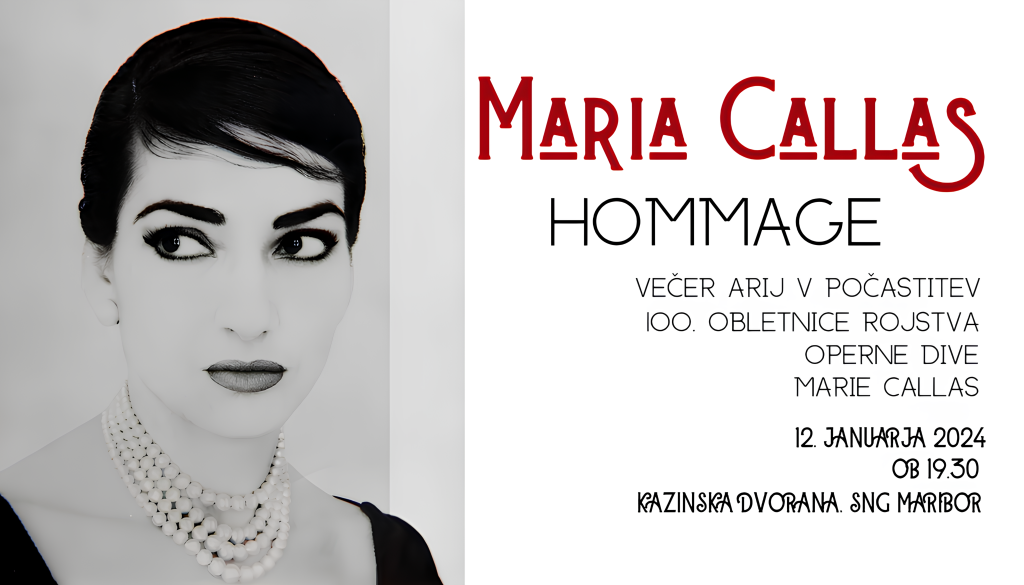 Kazinska dvorana SNG MariborVabljeni na koncert opernih arij ob 100. obletnici rojstva ene največjih umetnic 20. stoletja, operne dive Marie Callas, v Kazinsko dvorano SNG Maribor, 12. januarja 2024, ob 19:30. Sprehodili se bomo skozi njeno občudovanja vredno kariero in burno življenje.