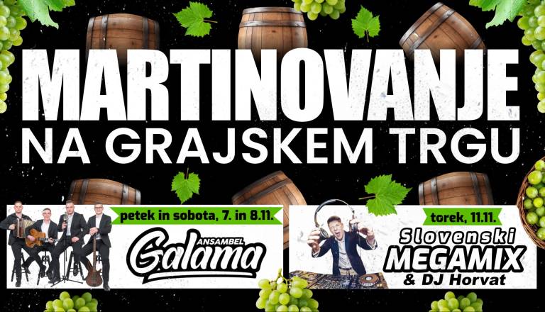 Snemanje klopotca, krst mošta, vino, vesela družba, ljudski praznik. «Vino ni rado samo,« pravi slovenskih pregovor, pridite, da boste delali družbo dobri kapljici, prijateljem in »Martinovim družabnikom«. Prikaz ljudskih šeg na Martinovo, Samo Tuš – Korl in zabava z ansamblom Šestka. Bogata ponudba domačih dobrot in rujne kapljice. Zapeljali se boste lahko tudi z vlakcem Jurčkom.