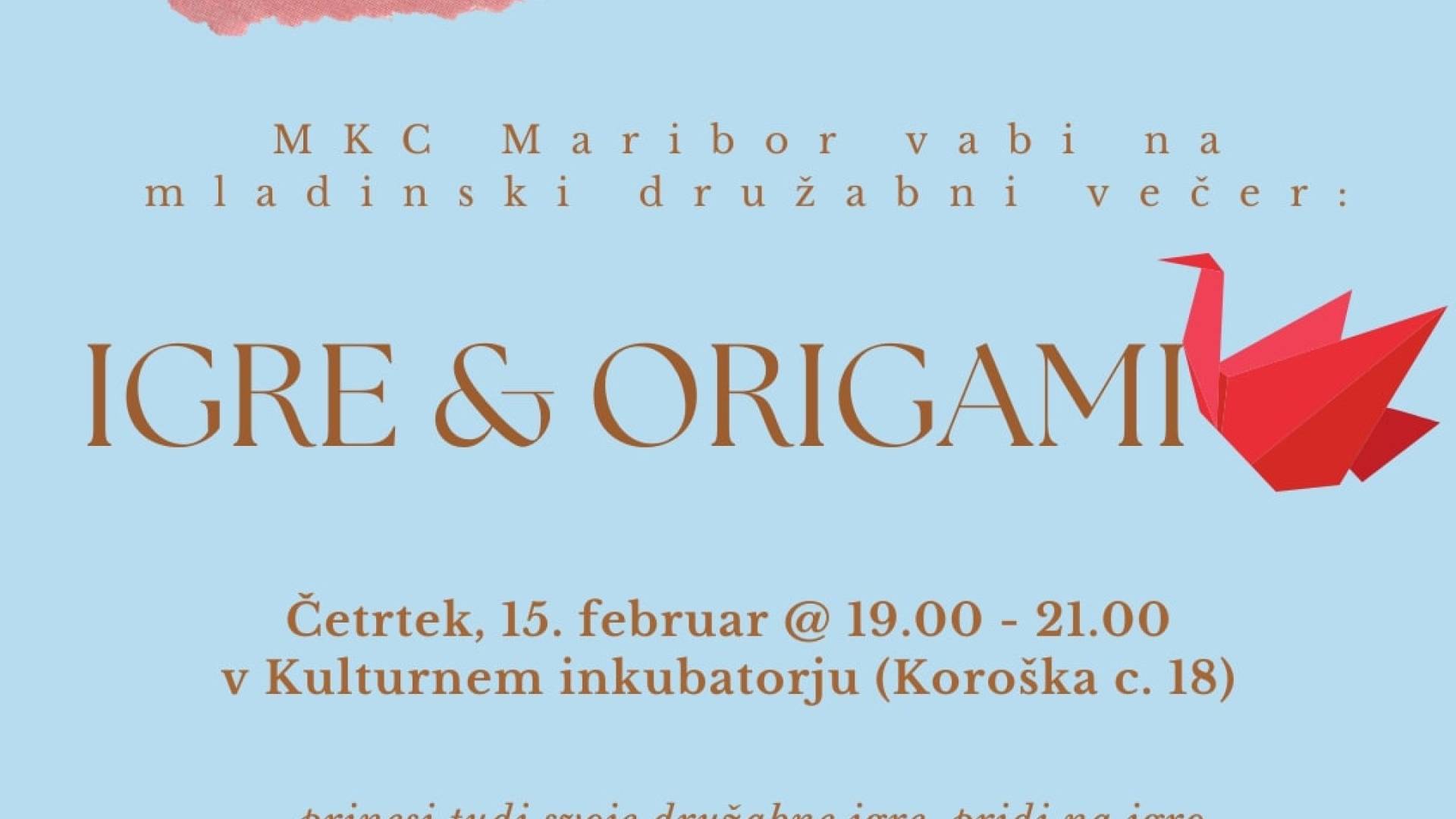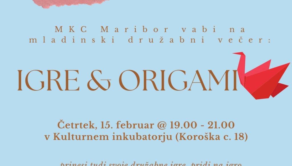 Kulturni inkubator, Koroška ulica 18, MariborV četrtek, 15. februarja ob 19. uri se znova družimo v Kulturnem inkubatorju ob igranju namiznih družabnih iger kot so Jungle Speed, Uno Flip, klasični remi. Tisti z bolj nemirnimi nogami pa vabljeni v klet oziroma "MKC gaming room", ki ponuja tudi namizni tenis in namizni nogomet. Kot običajno, dobre glasbe in prigrizkov ne bo manjkalo.