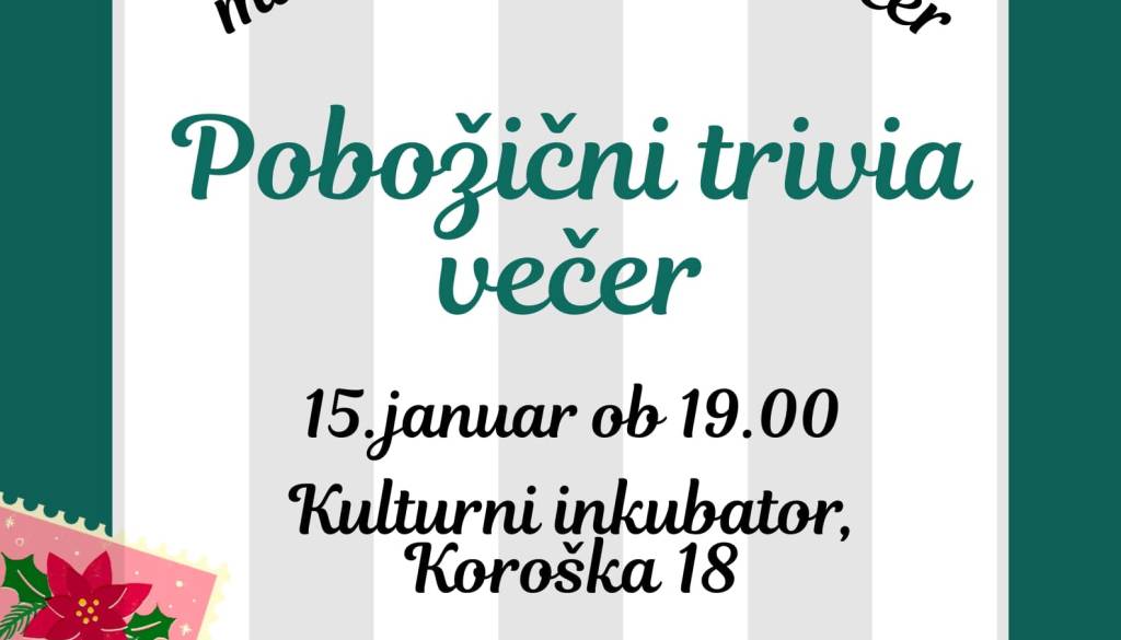 Trivia večer bo odet v pobožično vzdušje – kako dobro torej poznaš zanimiva in smešna dejstva o Božiču, prazničnih tradicijah in novoletnih vraževerjih? Gremo stavit, koliko bo “kako tega sploh ne vem?!” momentov? Zberi ekipo prijateljev in se vidimo v¨(še vedno decembrsko okrašenem) Kulturnem inkubatorju.