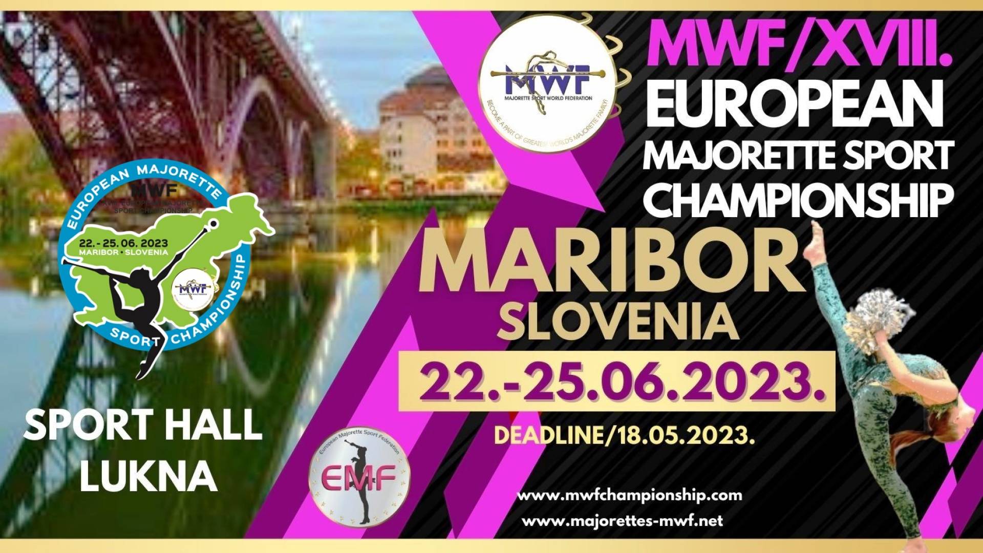 MWF/XVIII.EUROPEAN MAJORETTE SPORT CHAMPIONSHIP/Maribor-SLO,22.-25.06.2023. Jana Bohar | 20. junij 2023 11:45 v Šport Termin Četrtek, 22. junij 2023 9:00 - Nedelja, 25. junij 2023 21:00 Lokacija Ljudski vrt Vabljeni!