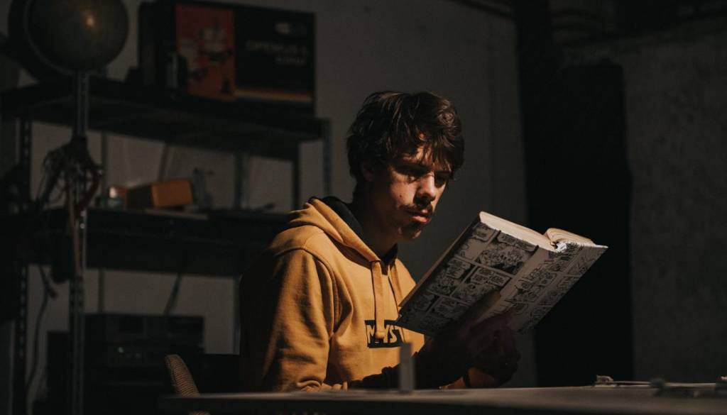 GT22 Glavni trg 22 MariborOboževalec in zbiratelj Mustrovih stripov v svoji sobici spet prebira dogodivščine Zvitorepca, Lakotnika in Trdonje. Stari junaki oživijo pred njegovimi očmi in skupaj odpotujejo na luno!