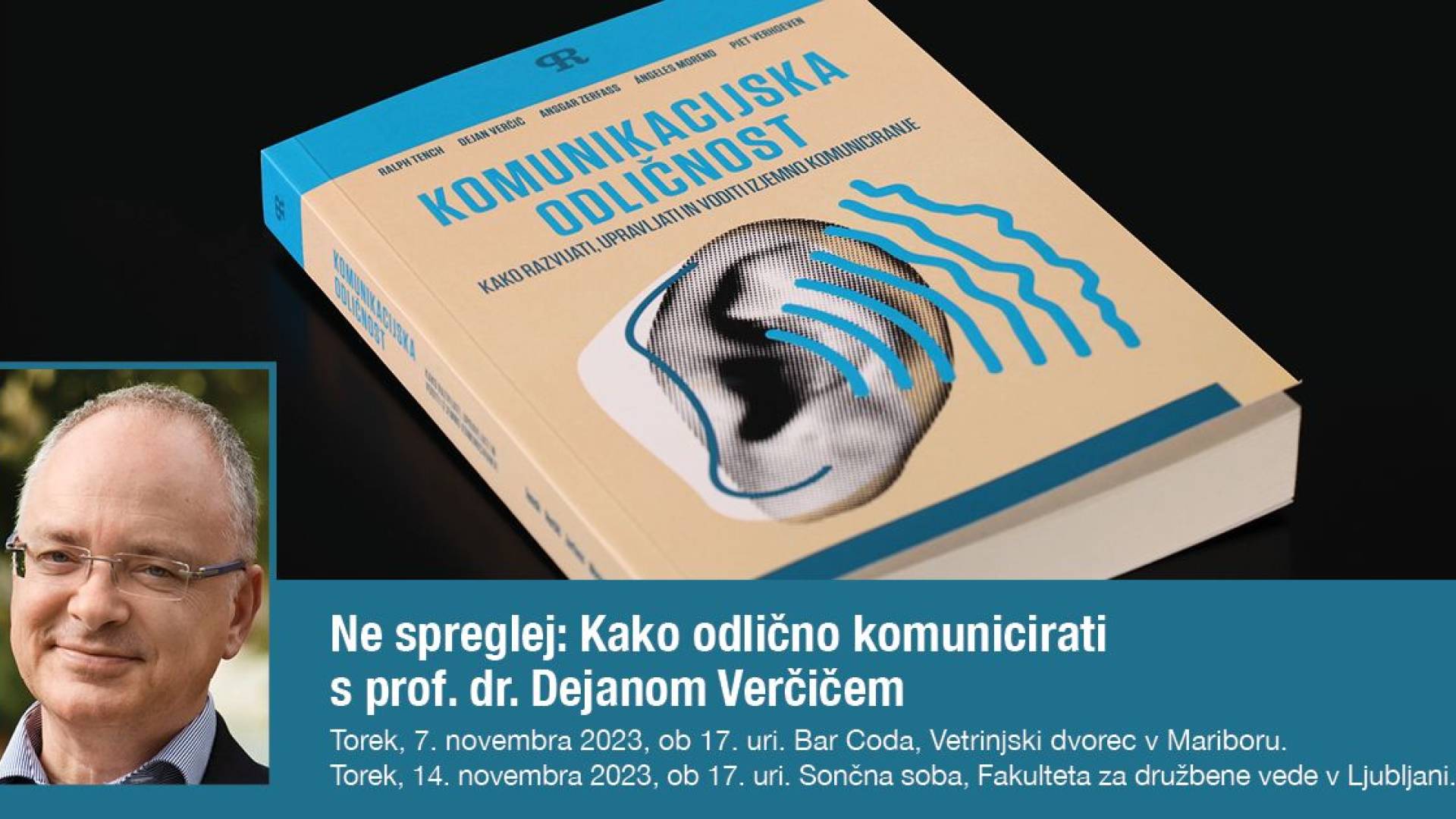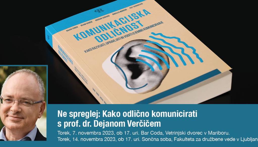 Vljudno vabljeni v torek, 7. novembra 2023, ob 17. uri v Bar Coda, Vetrinjski dvorec v Mariboru. Na dogodkih bo prof. dr. Dejan Verčič predstavil tudi svoje poglede na prihodnost odnosov z javnostmi in ključne ugotovitve iz nove knjige Komunikacijska odličnost. Knjiga Komunikacijska odličnosti, ki jo je prof. dr. Dejan Verčič napisal s kolegi iz Nemčije, Španije in Velike Britanije, je danes na voljo v angleškem, slovenskem, španskem in kitajskem jeziku: https://www.fdv.uni-lj.si/zalozba/knjige/komunikacijska-odličnost.