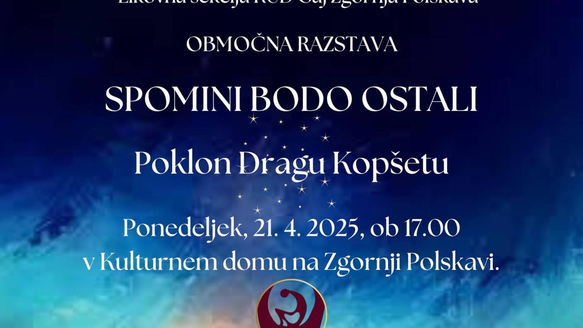 Kulturni dom Zgornja PolskavaLikovna sekcija KUD Gaj Zgornja Polskava vabi na razstavo v Kulturni dom na Zgornji Polskavi. Prireditev je posvečena nedavno preminulemu Dragu Kopšetu.