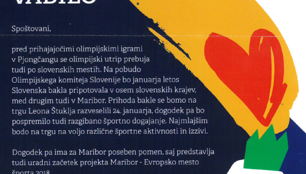 Na trg Leona Štuklja bo 24. januarja v spremstvu mariborskih športnikov, olimpijcev in pomembnih osebnosti športa pri nas prispela Slovenska bakla. Dogodek bo za Maribor posebnega pomena, saj ga bo zaznamovala uradna otvoritev projekta Maribor - Evropsko mesto športa 2018.