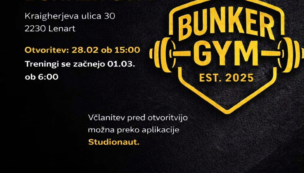Kraigherjeva ulica 30, 2230 Lenart v Slovenskih goricah, Slovenija28.02 ob 15:00 odpiramo vrata novega fitnesa v Lenartu (Kraigherjeva ulica 30). Pridruži se nam na otvoritvi in začni trenirati z nami od 01.03. ob 6:00. Članstvo je možno že pred otvoritvijo, več na www.bunkergym.si