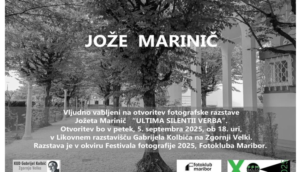 OTVORITEV FOTOGRAFSKE RAZSTAVE ULTIMA SILENTII VERBA gubicnives | 3. september 2025 12:42 v Termin Petek, 5. september 2025 18:00 Lokacija Poročna dvorana Zgornja Velka Vabljeni.