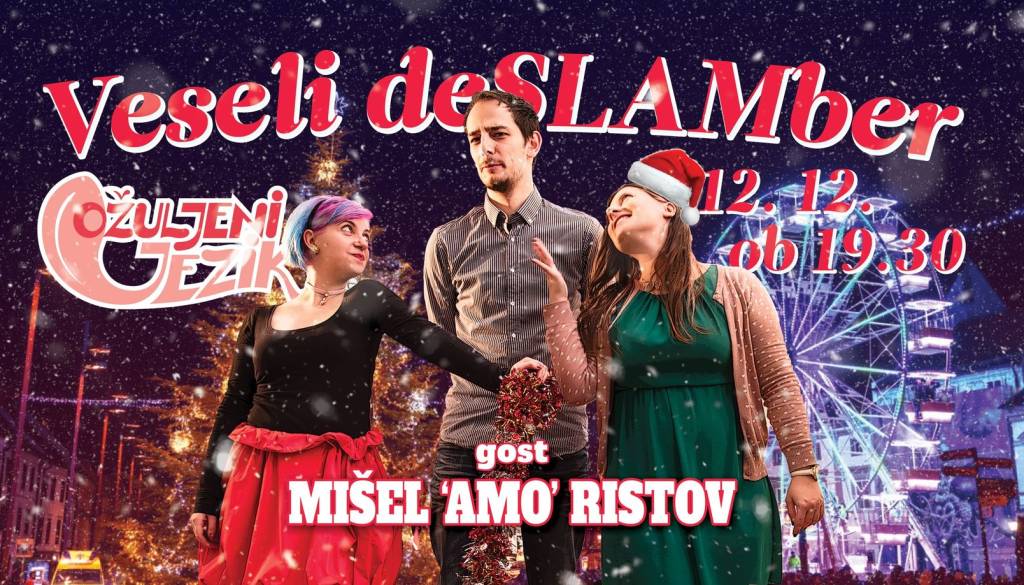 Oh, spet je ta najlepši čas v letu, ko na ulicah zasijejo lučke, ko se prijetno kadi iz papirnatega kozarčka s kuhanim in na Glavnem trgu postavijo razgledno kolo, ki je že malo višje kot lansko. Tako je - veseli december je tukaj! Ne glede na to, če božične komade ljubite ali sovražite, če ste oblekli grd božični pulover z jelenčki v vprašljivih pozah ali pa nosite črn puli, na slam odru ste vsi dobrodošli! Tokrat pa bo Ožučjeni jezik imel tudi dobrodelno noto, saj bomo vse vaše zbrane donacije poklonili projektu Botrstvo za otroke iz socialno šibkih družin!