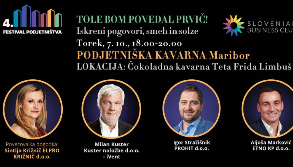 Čokoladna kavarna Teta Frida LimbušPodjetniška kavarna je dogodek na katerem uspešne podjetnice in podjetniki odstirajo zanimivosti s svoje poslovne poti ter spregovorijo o uspehih, lekcijah in napakah, iz katerih so se največ naučili.Podjetniške kavarne so se v štirih letih uveljavile kot prostor, kjer lahko prisluhnemo najboljšim podjetniškim zgodbam. Ponujajo vpogled v razmišljanje vrhunskih podjetnikov, ki neposredno in odkrito spregovorijo o uspehih, zdrsih, vzponih, padcih in lekcijah na svoji podjetniški poti. Vabljeni na večere smeha in solz v družbi najuspešnejših slovenskih podjetnikov! Podjetniške kavarne so namenjene vsem, ki vas zanimajo podjetništvo in zgodbe najboljših slovenskih podjetnikov. Udeležba je brezplačna.