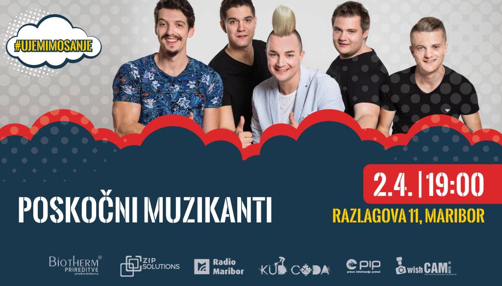 Razlagova 11, MariborKoncert v podporo KUD Coda za projekt Glasbeni junaki, s katerim bodo mladi glasbeni talenti dobili nove prostore za ustvarjanje. Koncerti se bodo odvijali v 'dnevni sobi' za omejeno število obiskovalcev (do 40). Vstopnice so na voljo na https://www.adrifund.com/project/view/710. ?#ujemimosanje